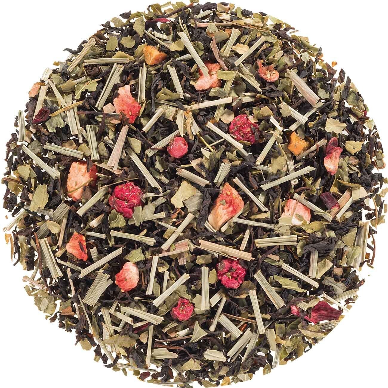 Zwarte thee, aardbeibladeren, citroengras, pepermunt, hibiscus, stukjes appel, stukjes aardbei, rode bessen, aroma, natuurlijk pepermuntaroma, natuurlijk limoenaroma